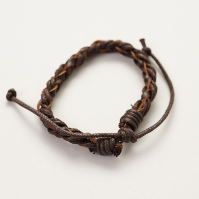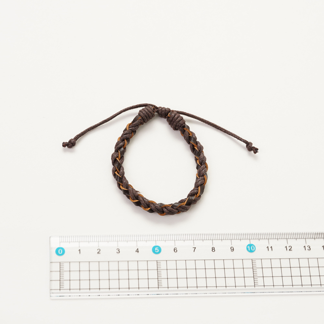 紐をひっぱるだけで装着できます。人気の編み込みレザー調のブレスです。