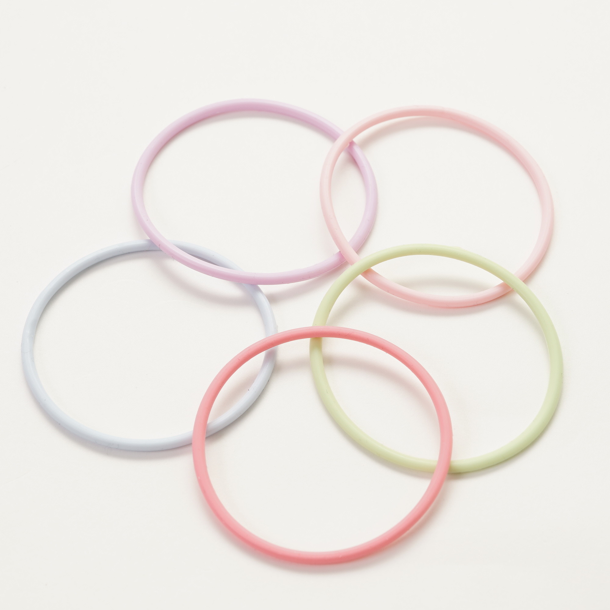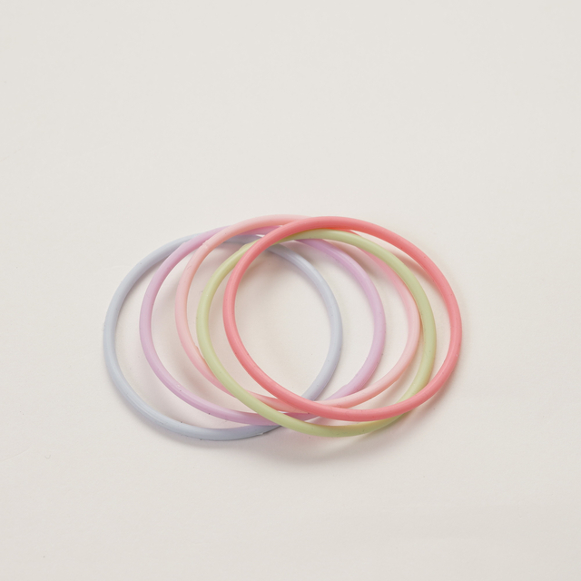 シリコン製の5色組のリングゴムです。5本まとめて束ねてもおしゃれでかわいらしさ演出します。